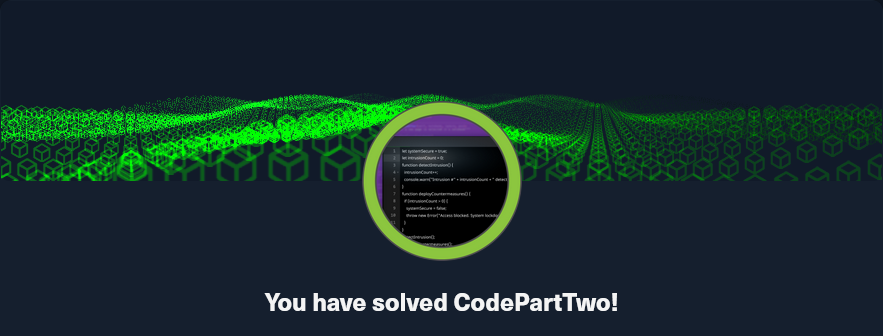 This machine was retired yesterday, so I decided to publish my writeup the day after. CodePartTwo is an easy machine, which runs a Flask web app vulnerable to RCE due to an outdated and vulnerable library it uses. Once exploited we can dump and crack the registered users' passwords hashes (MD5). That gives us a SSH access, along with the User Flag. Retrieving the Root Flag exploits a weakness in a backup utility the user has root access over (via sudo). ...